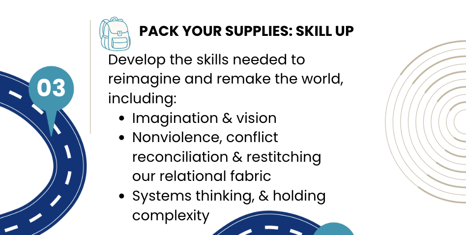 Skills like conflict reconciliation and nonviolence; our ability to step out of cycles of violence and harm, and instead to understand and respond to conflict as an incubator of possibilities.